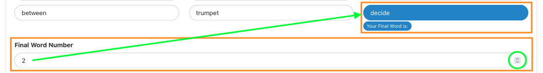 Scroll to the Final Word tab in the tool, and enter each of the four (or three) letter seed words in the correct order into the tool. Make sure you check each word carefully! By the time you reach the word, the EGG has automatically calculated and populated this field for you.